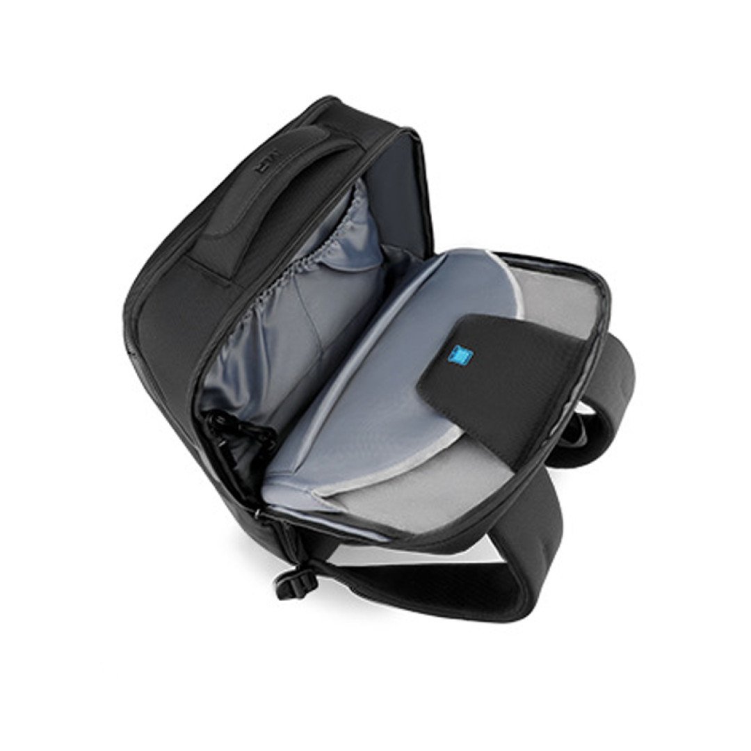 The backpack is perfect for carrying a laptop up to 15.6 inches, with the laptop compartment secured by a separate zipper. Its dimensions make it convenient for daily city use as well as for travel, and it can also serve as carry-on luggage on planes. Additionally, the backpack has two external USB/microUSB ports, allowing you to charge your smartphone on the go or power bank in the waiting area.