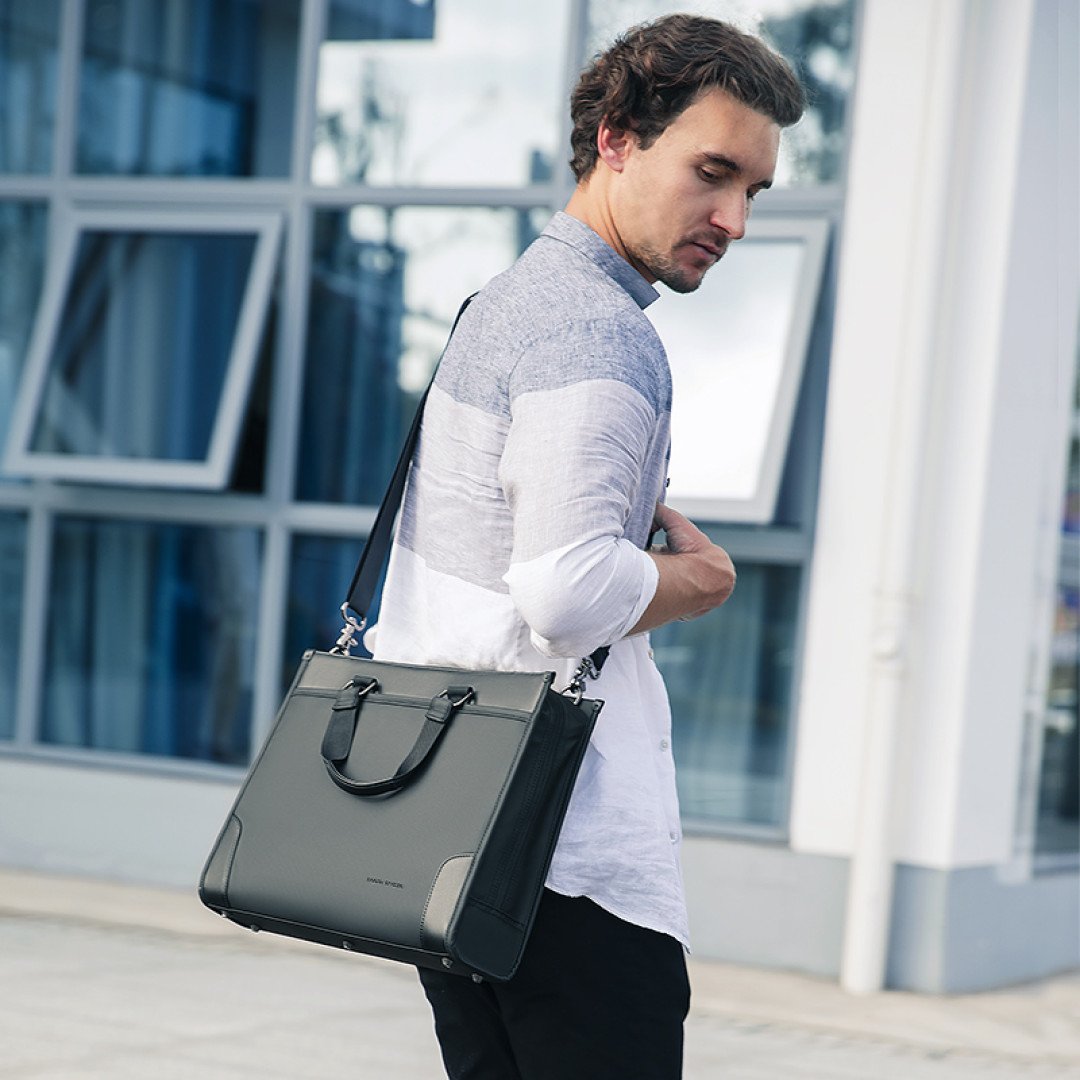 The bag features short handles for carrying and a detachable shoulder strap. It is made from durable, wear-resistant, and water-resistant fabric that protects your laptop from moisture on rainy days. Practical feet on the bottom allow the bag to stand stably on any surface.